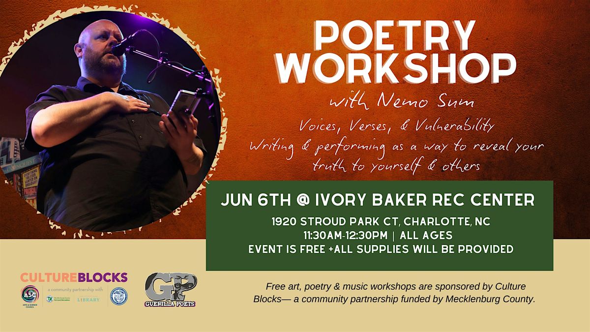 Free art, poetry & music workshops are sponsored by Culture Blocks— a community partnership funded by Mecklenburg County.