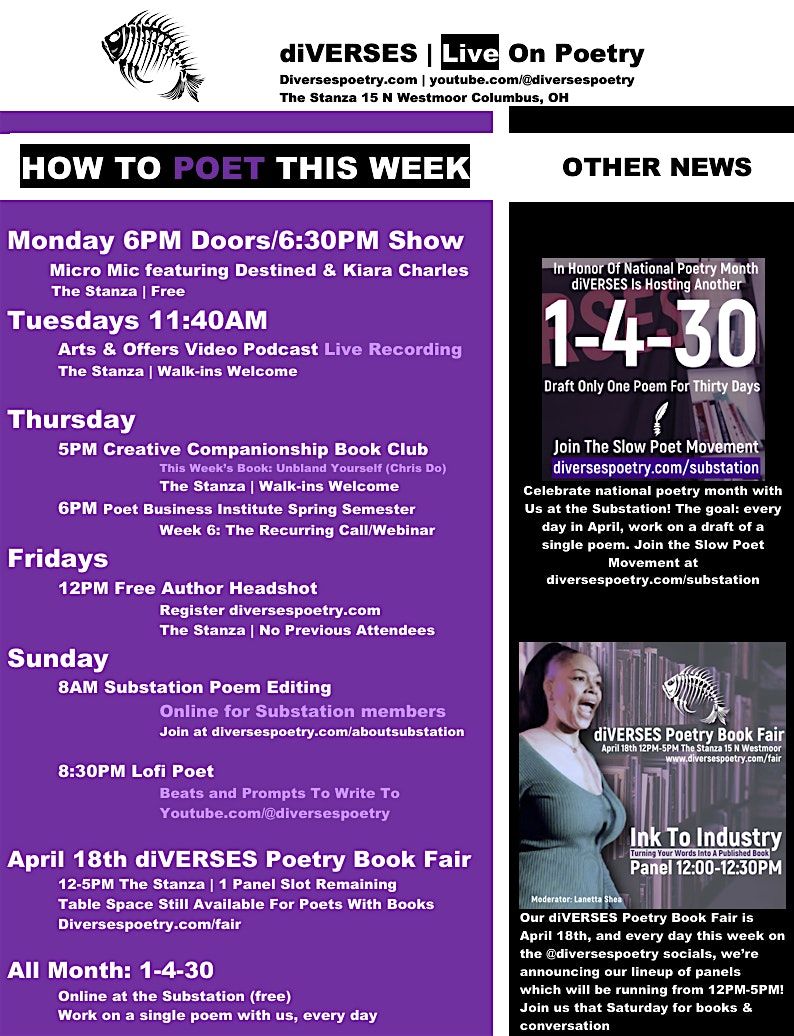 1-4-30: instead of a 30/30, we're working on a single poem, every day in April. It's a unique stamina challenge for writing; free over at the Substation