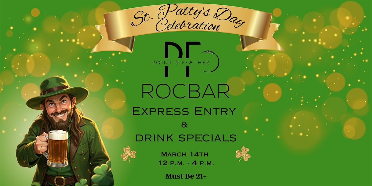 Enjoy express entry at both Point & Feather and Rocbar! The shenanigans go from 12pm-4pm on Saturday 3/14/26! Must be 21+About this Event