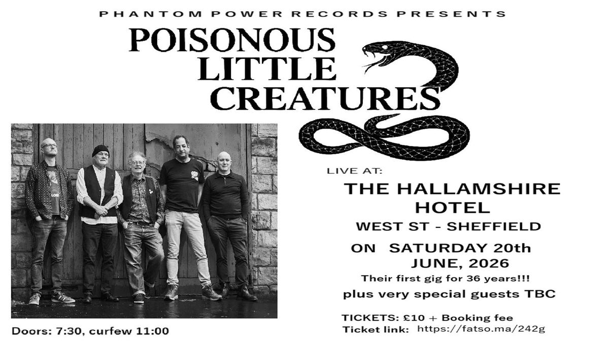After an absence of 36 years, Poisonous Little Creatures make their return to the stage. It will be the band's first gig for over three decades when they return at The Hallamshire Hotel, West Street, on Saturday 20th June, 2026.: the only venue they played back in the day that hasn't been either demo'ed or closed down! With founding member Pete Vanston retired from the stage, Denzil Watson (vocals), Kirk Nelson (guitars) and Michael Fearnley (drums) are joined by Denzil's ex-RepoMen bandmate Simon Tiller on bass and Lee Bradley on keyboards.