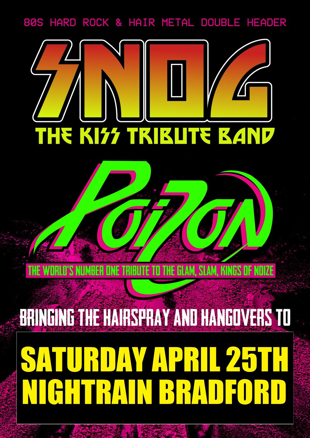 Bringing the hairspray and hangovers to Nightrain in Bradford on Saturday April 25th. Poizon/ Snog double header. (Poizon/ Kiss tributes).