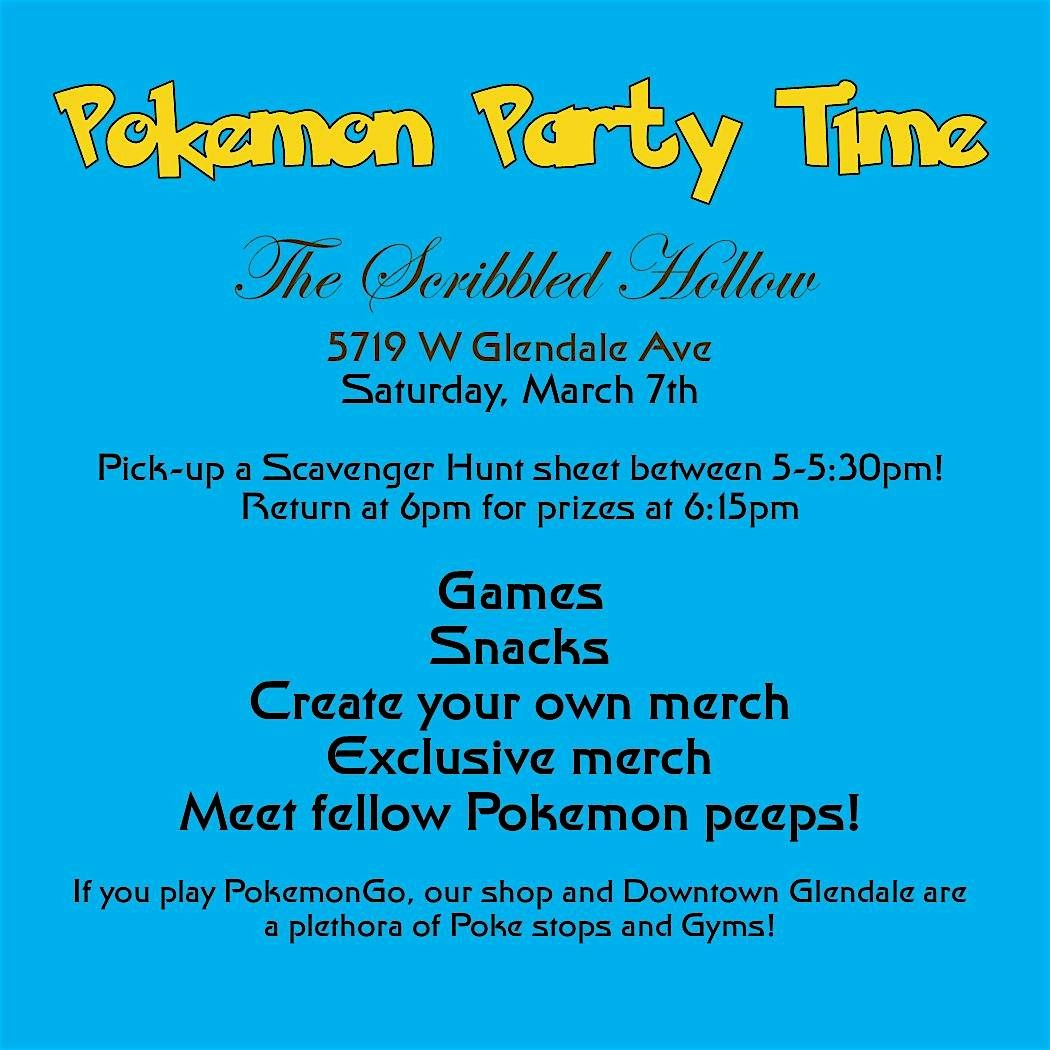 Get ready for an epic Pokemon Party! Join us in person for loads of fun, games, and of course, plenty of Pokemon vibes. Whether you're a seasoned Trainer or just starting out, this is the perfect chance to meet fellow fans and catch 'em all together. Don't miss out on the excitement—come hang out, trade, battle, and celebrate everything Pokemon!