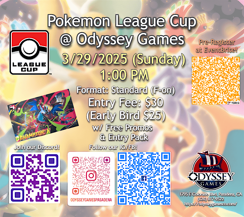 1) You can pre-register at Eventbrite page https://www.eventbrite.com/e/pokemon-tcg-league-cup-jan-mar-odyssey-games-pasadena-tickets-1983210703601?aff=oddtdtcreator before Mar 29th to enjoy the early bird price.