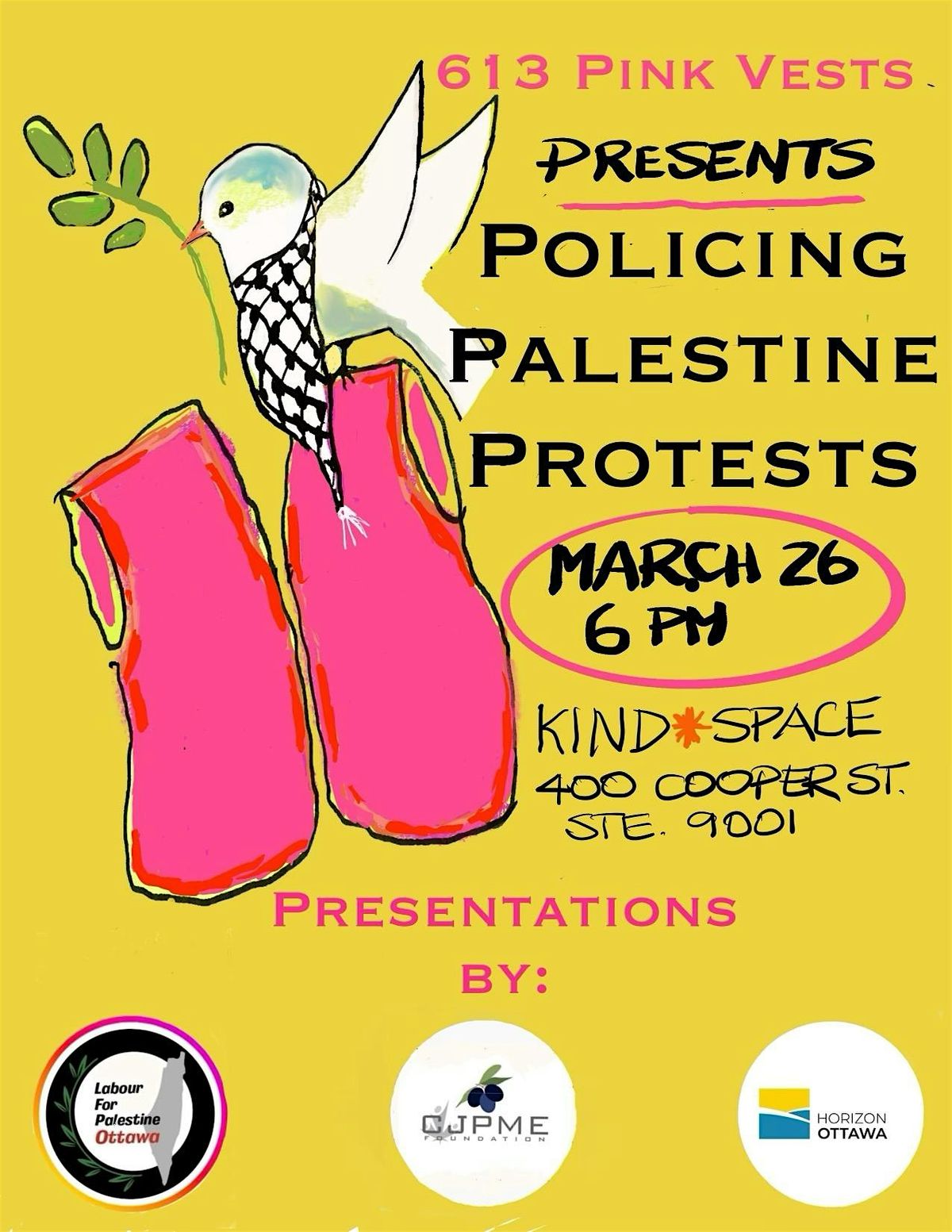 Please join legal observer collective 613 Pink Vests for this workshop on policing Palestine solidarity in Ottawa, featuring presentations and reports from researchers, lawyers, and activists with expertise and on-the-ground experience in the Palestine liberation movement. We'll learn about the criminalization of Palestine solidarity in Ottawa and across Canada, as well as how the movement has been fighting back and how we can strengthen that response.