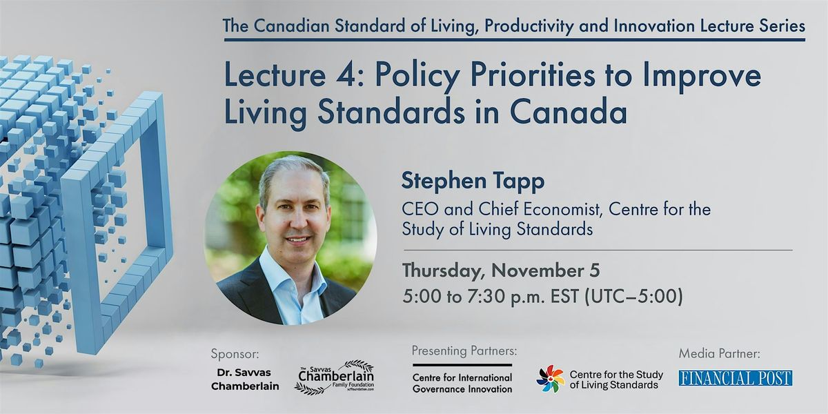 The fourth lecture of The Canadian Standard of Living, Productivity and Innovation series will be presented by Stephen Tapp, CEO and chief economist of the Centre for the Study of Living Standards. He will identify policy priorities and how new variables should inform Canada’s strategy to enhance national productivity, economic growth, and prosperity.