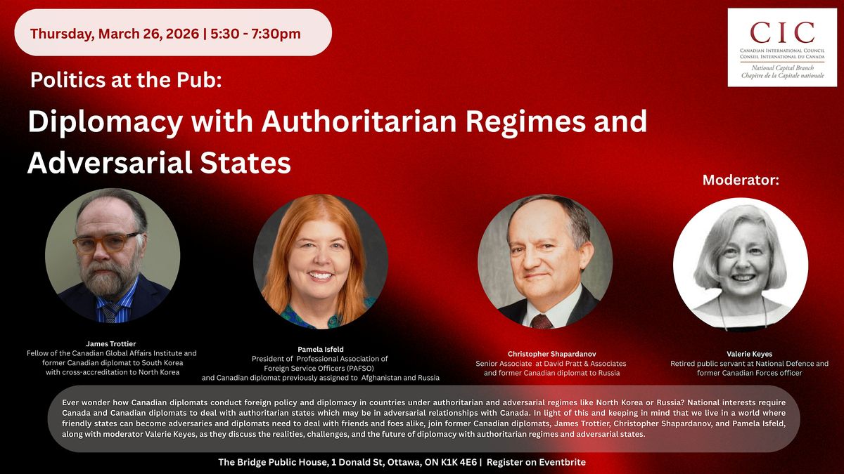 Ever wonder how Canadian diplomats conduct foreign policy and diplomacy in countries under authoritarian and adversarial regimes like North Korea or Russia? National interests require Canada and Canadian diplomats to deal with authoritarian states which may be in adversarial relationships with Canada. In light of this and keeping in mind that we live in a world where friendly states can become adversaries and diplomats need to deal with friends and foes alike, join former Canadian diplomats, James Trottier, Christopher Shapardanov, and Pamela Isfeld, along with moderator Valerie Keyes, as they discuss the realities, challenges, and the future of diplomacy with authoritarian regimes and adversarial states.