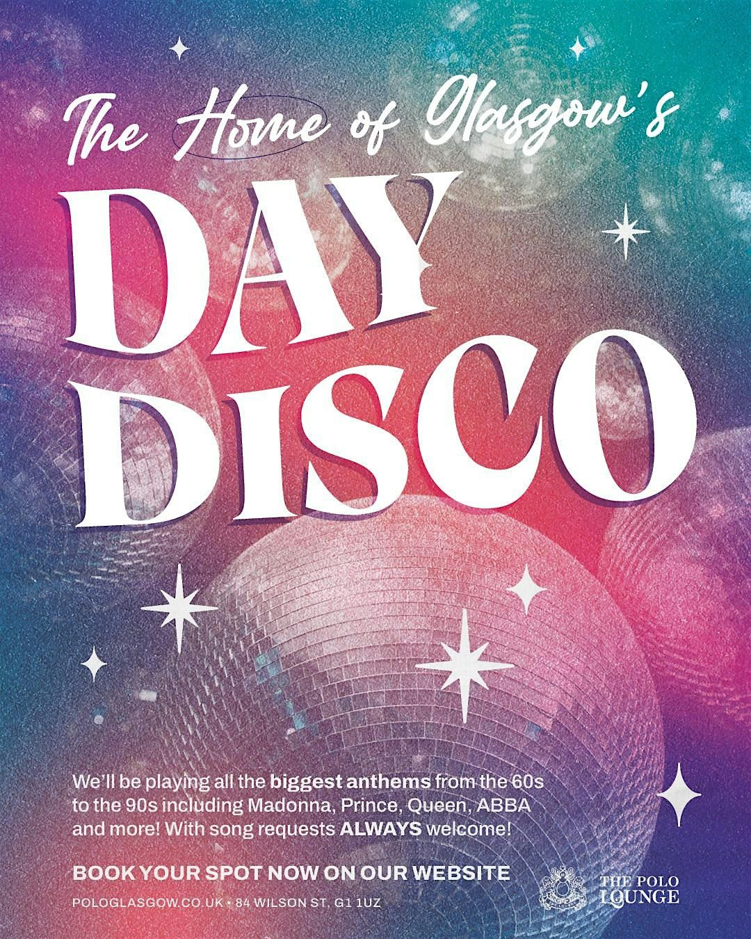 Still got the moves but want to be home by 10pm? It's the return of Glasgow's Day Disco! We'll be playing all the biggest anthems from the 60s to the 90s including Madonna, Prince, Queen, ABBA and more! With song requests ALWAYS welcome! Whatever you're celebrating, this is the perfect option! We're here for all dance abilities! GROUP BOOKINGS WELCOME Grab your FREE tickets today.