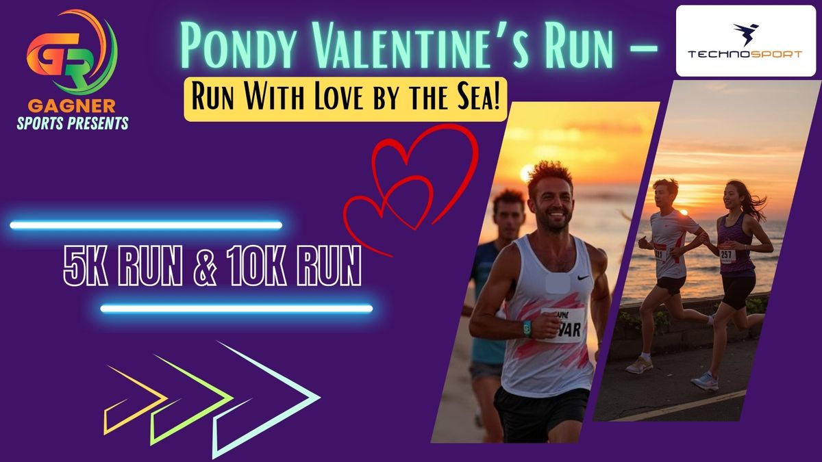 Pondy Valentine’s Run – Run With Love by the SeaCelebrate love, fitness, and togetherness this Valentine’s season at the most romantic running event by the ocean! Pondy Valentine’s Run – Run With Love by the Sea invites couples, friends, families, and solo runners to experience an unforgettable sunrise run along the beautiful Puducherry coastline.  Event Categories 5K Fun Run (Non-Timed) – Open to all, perfect for beginners and fun runners10K Run (Timed with Chip) – Open to all competitive runners  Participant DeliverablesAll registered participants will receive: Event T-Shirt Finisher Medal Certificate Refreshments Prize Money & TrophiesWinners in Men & Women categories (1st, 2nd & 3rd place) will receive Cash Prizes + Trophy in both distances. 5K Category (Men & Women): 1st Prize – ₹3,000 2nd Prize – ₹2,000 3rd Prize – ₹1,000 10K Category (Men & Women): 1st Prize – ₹4,000 2nd Prize – ₹3,000 3rd Prize – ₹2,000 Run with your loved one, feel the sea breeze, watch the sunrise, and make this Valentine’s Day truly special.Run with Love. Run by the Sea. Run with Gagner Sports.