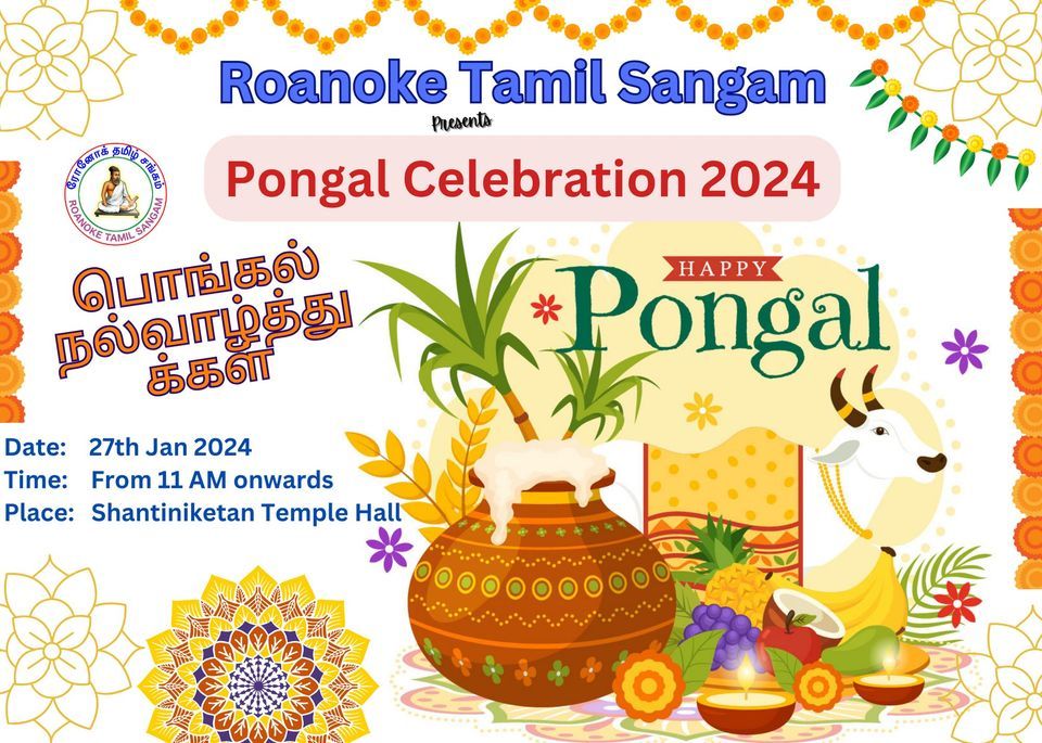 Roanoke Tamil Sangam is excited to organize this year Pongal festival event. We are planning to celebrate our function on 27th Jan 2024 at Shantiniketan Temple Hall from 11 AM. We will do our traditional Pongal making, Banana leaf lunch and performances. Let’s meet and celebrate our Harvest Pongal festival in grand manner. Its Potluck lunch and its Private event.Please reach out to signup the event. Thanks