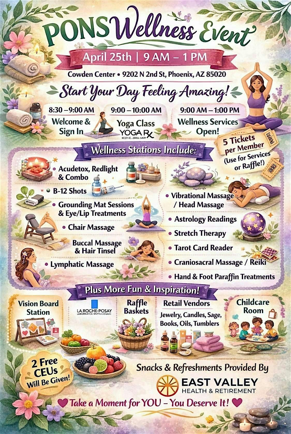 We'll kick things off with a nurse-led yoga class, followed by a variety of amazing wellness services to chose from, give-aways, snacks, and much more.
