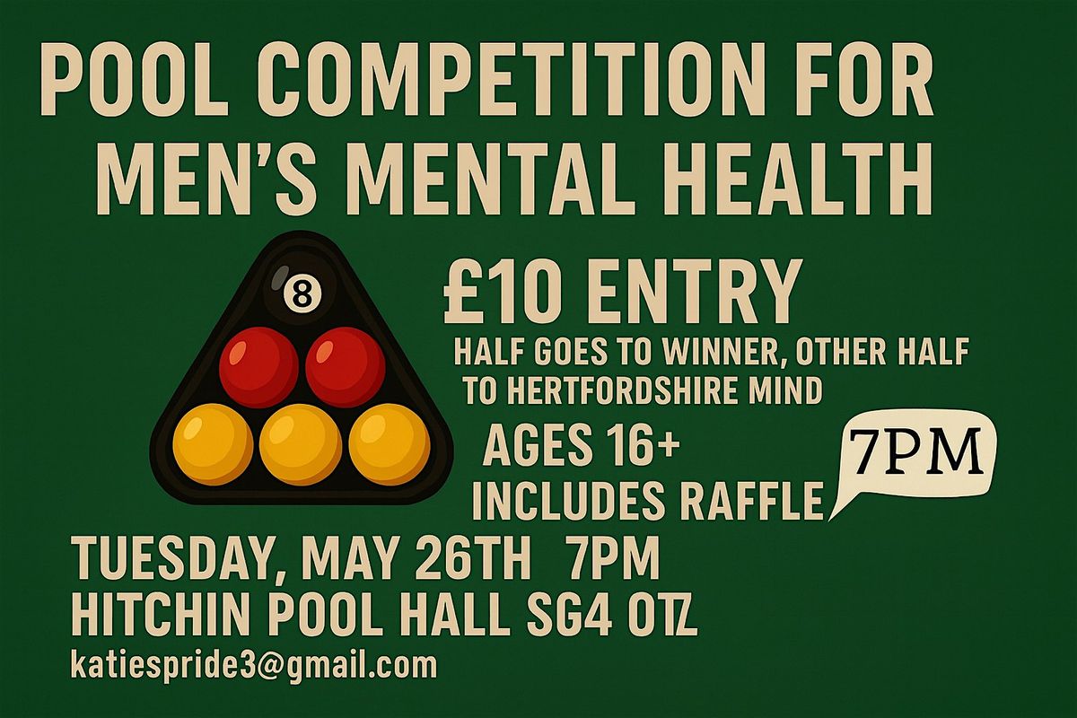 Join us for a community pool competition dedicated to supporting men’s mental health. The event features a friendly tournament, a raffle, and a chance to connect with others in a relaxed, supportive environment. Entry is £10, with half going to the winner and the other half donated to Hertfordshire Mind to help fund vital mental health services.