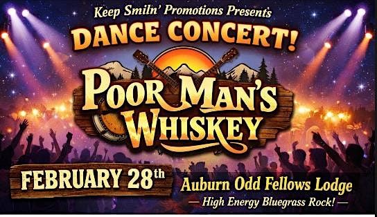 Get ready for a very very special evening by Poor Man's Whiskey ! PMW as thay are affectionately referred to is a big time favorite of Keep Smilin' & we are excited to announce we cajoled them into returning to Auburn. They have promised an amazing evening of Greatest Hits of their music along with some of their legendary covers from the likes of Jerry Garcia & Old and in the Way, The Beatles, Paul Simon, Allman Brothers, Eagles, Pink Floyd and more!!