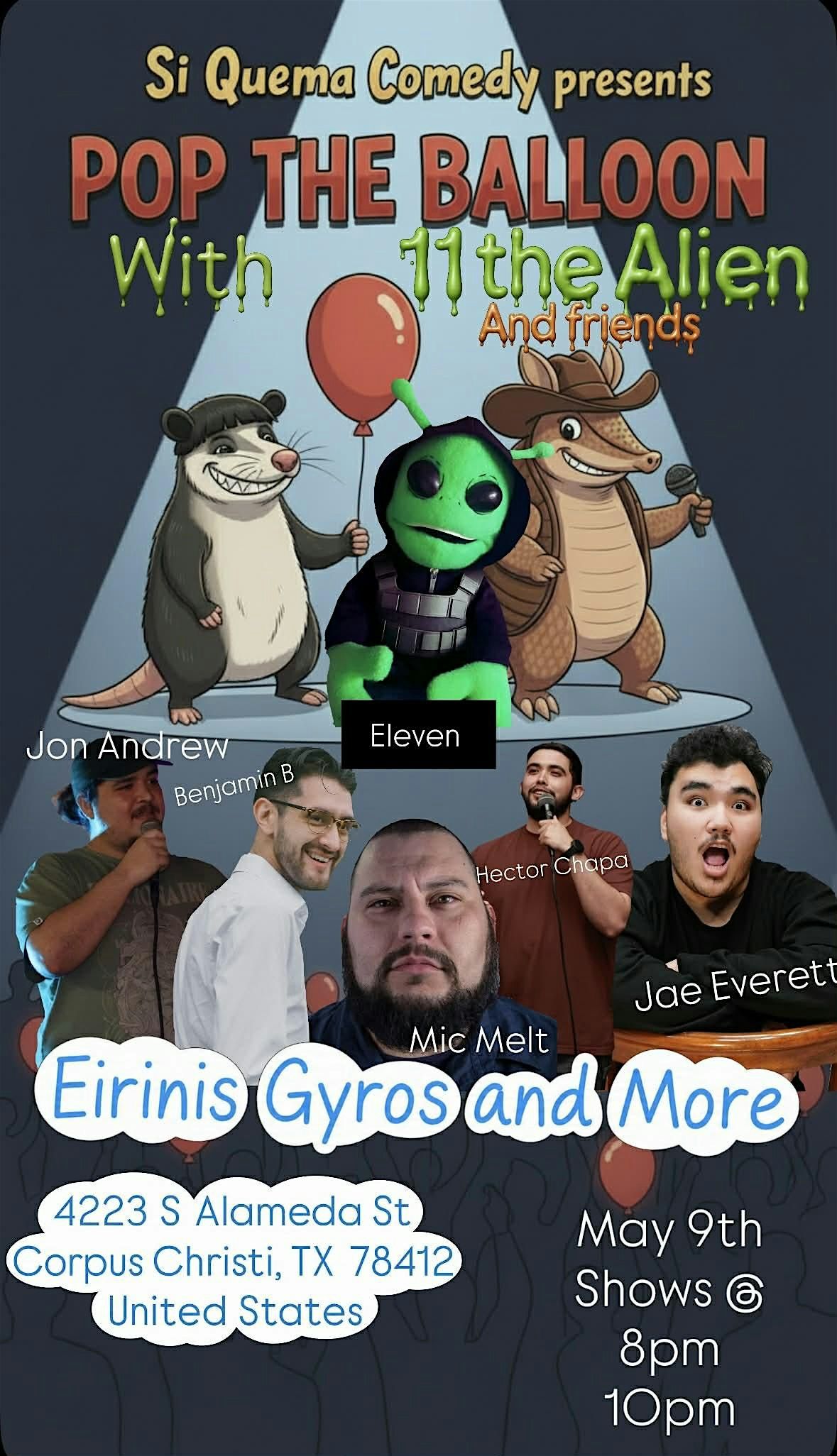 11 The alien hosts a comedy experiment like you've never seen before comedians walk up do their set if an audience member does not like a joke that is said a balloon will be popped in an interview will be taking place as to why the balloon was popped. it all goes down Saturday, May 9 at the Shine Box (upstairs at Eirinis Gyros and more.) you don't wanna miss it. It's 2 shows 8pm and 10pm.
