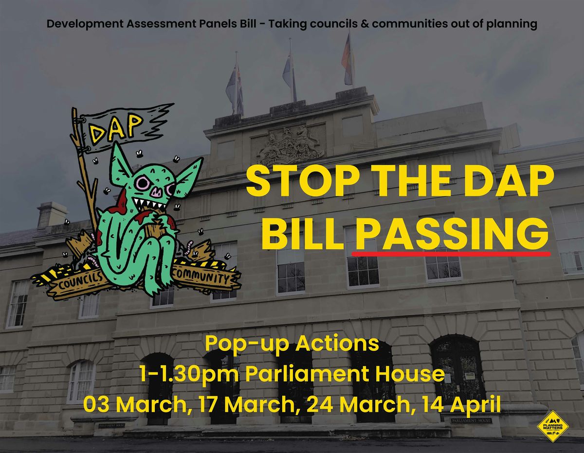 Every sitting week for the next four weeks of Parliament — 3, 17, 24 March and 14 April 2026— Planning Matters Alliance Tasmania (PMAT) and friends will be popping up outside Parliament House from 1–1.30pm because the Government is not listening and the Development Assessment Panels (DAP) Bill must be defeated once and for all.