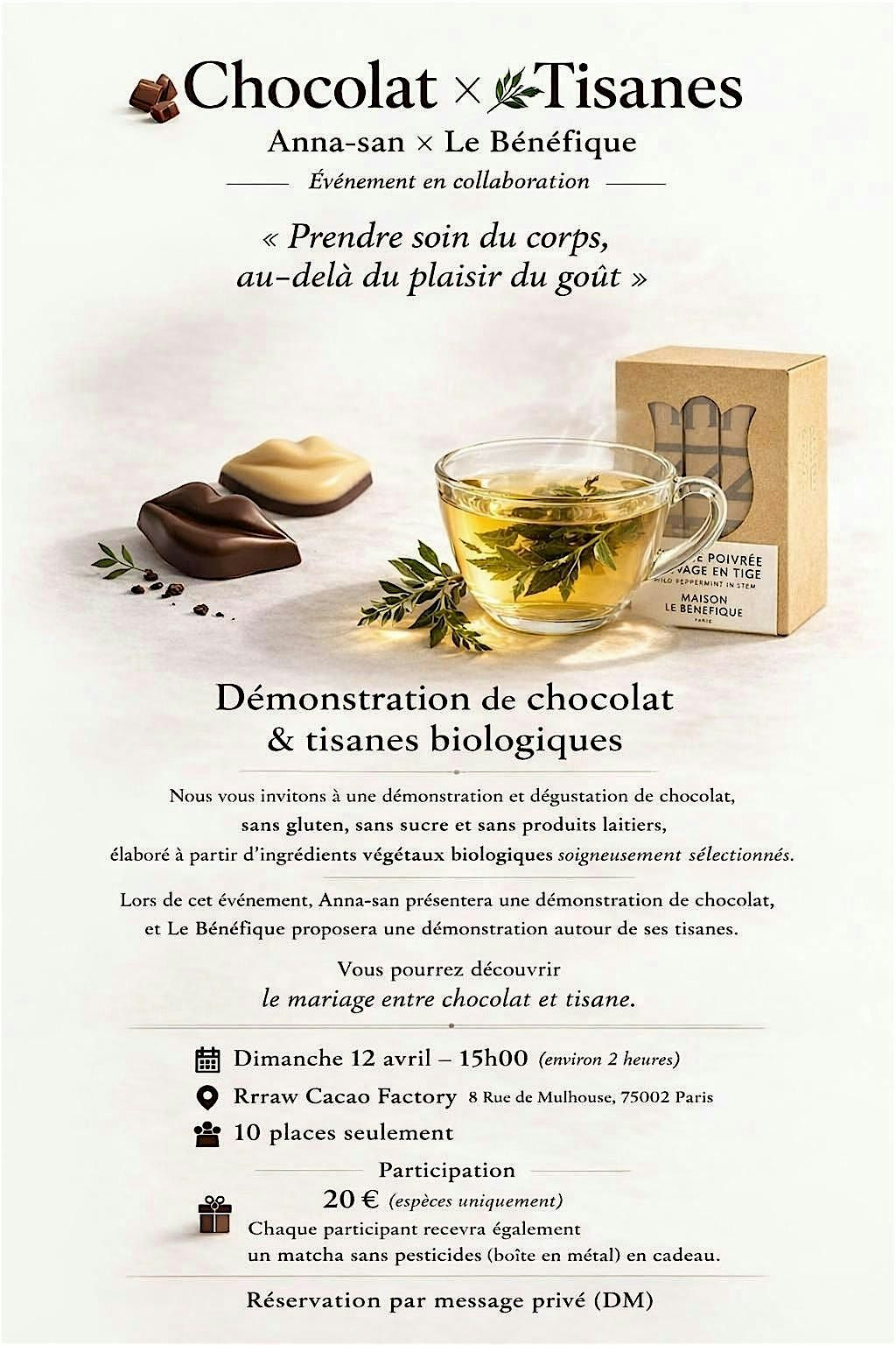 Viens découvrir ce super pop up en personne où Anna-san/Chocolat rencontre Le Benefique pour te faire goûter des chocolats (sans gluten, sans sucre et sans produits laitiers) et des tisanes bio. Une occasion parfaite pour chiller, papoter et savourer des saveurs authentiques. On t'attend pour un moment convivial et plein de bonne vibes !