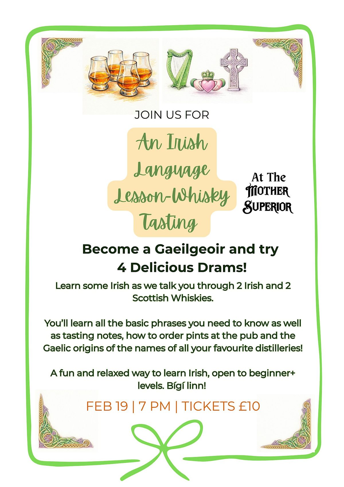 They’re might even be a cheeky discount for those who are brave enough to order their pint “as Gaeilge” after the event! Tickets are £10 pp and can be booked through the bar.