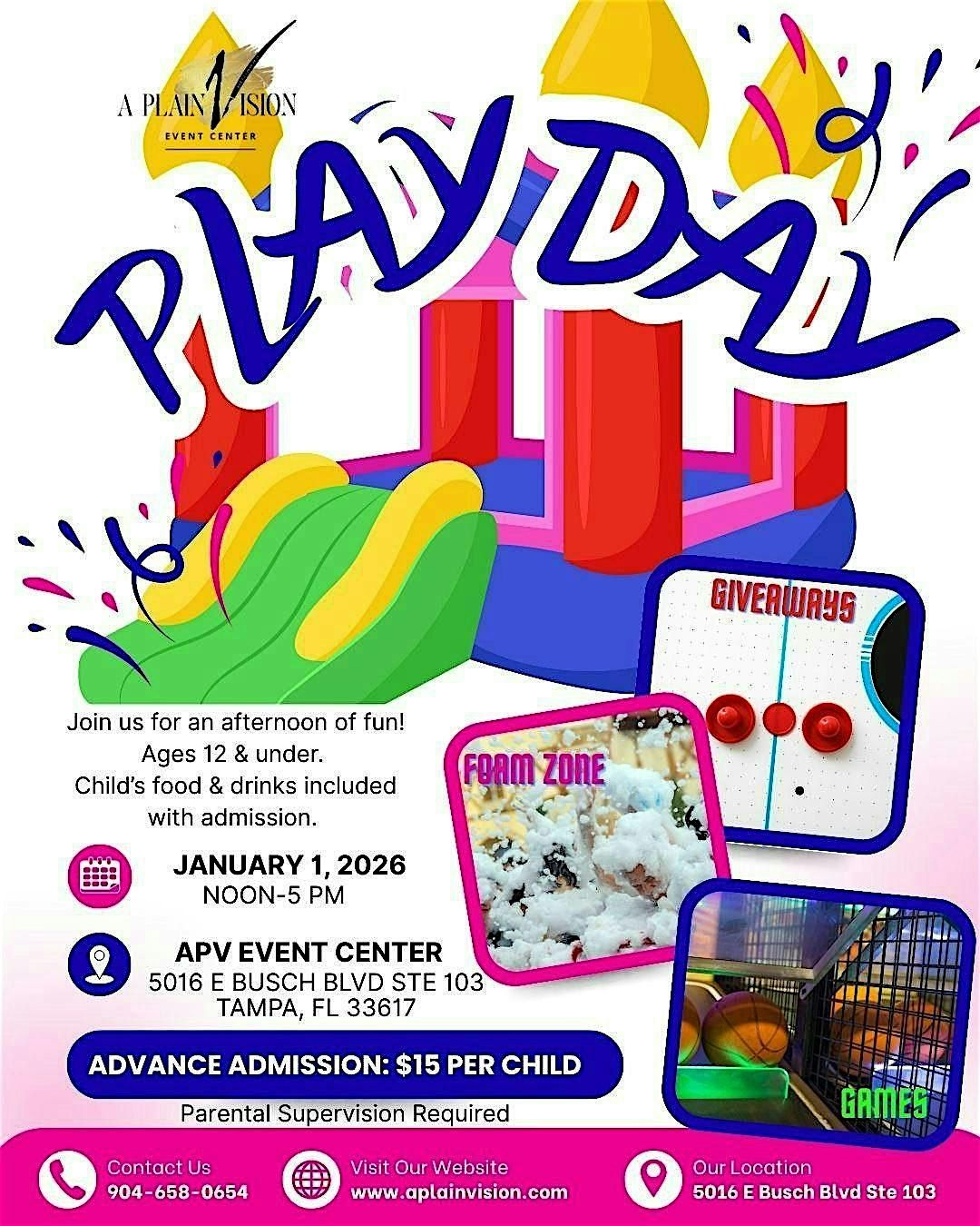 Welcome to Pop Up Play Day at A Plain Vision Event Center! Get ready for a day filled with fun activities and games for ages 12 and under. Join us on January 1, 2026, at 12:00 PM (Eastern Time) for an exciting event that will bring out your inner child. Let's make unforgettable memories together! See you there!