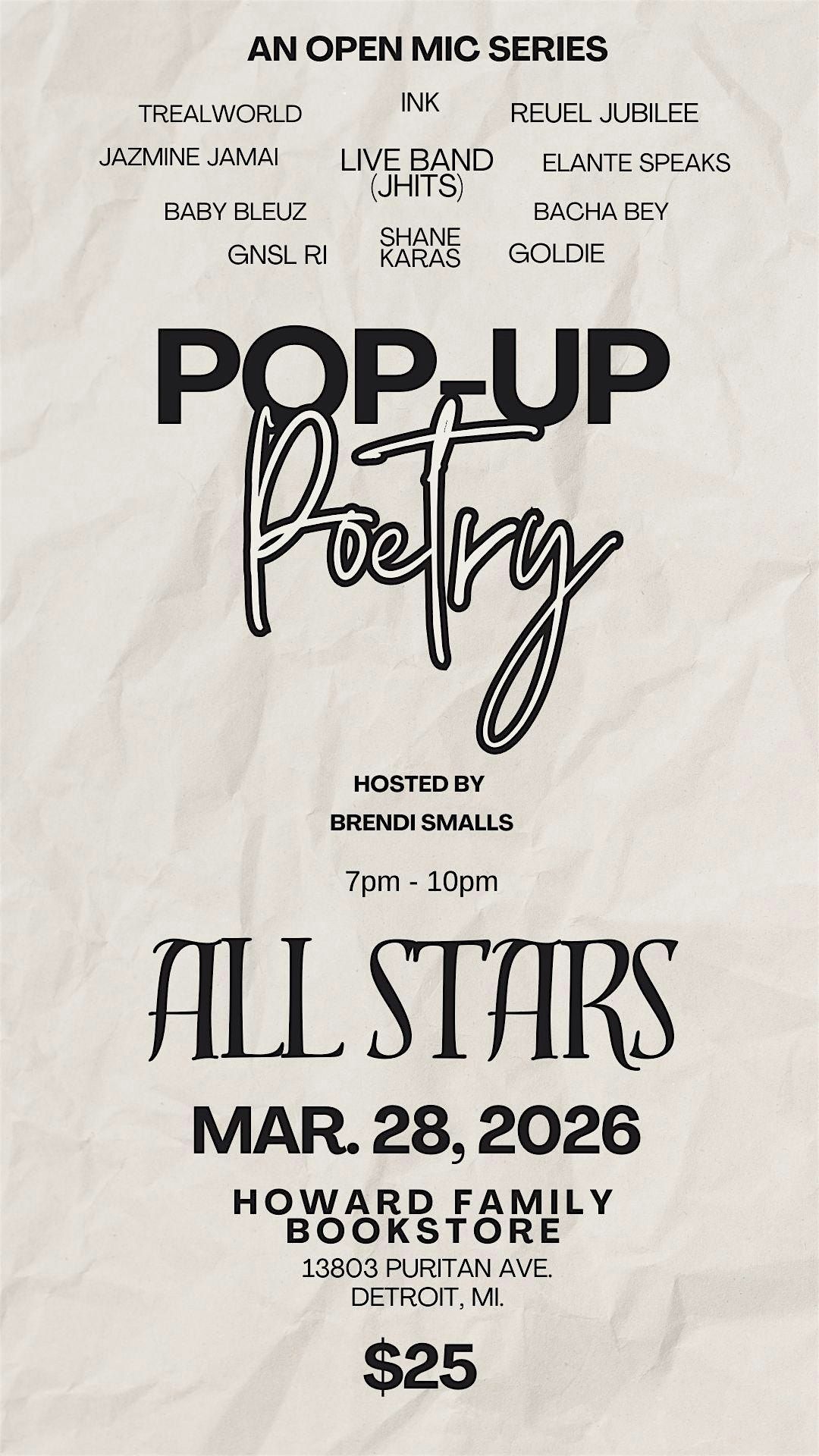 Join Pop-up Poetry for an ALL STAR evening of dope music & unforgettable vibes… A night inspired by the love of art.About this Event
