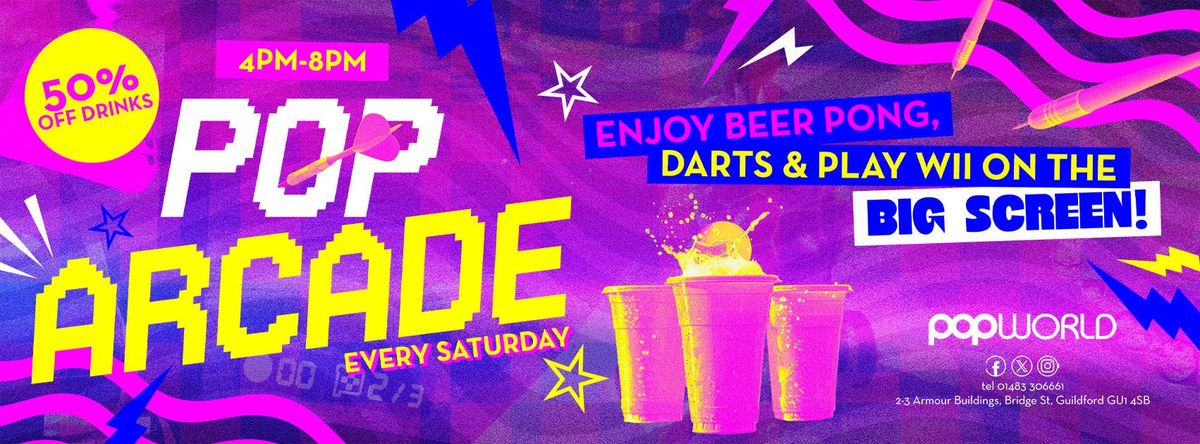 🎮 Pop Arcade at Popworld! 🎯Level up your weekend with Pop Arcade, every Saturday from 4pm to 8pm! Get your game face on for beer pong, darts and Wii games on the big screen while enjoying unbeatable deals!