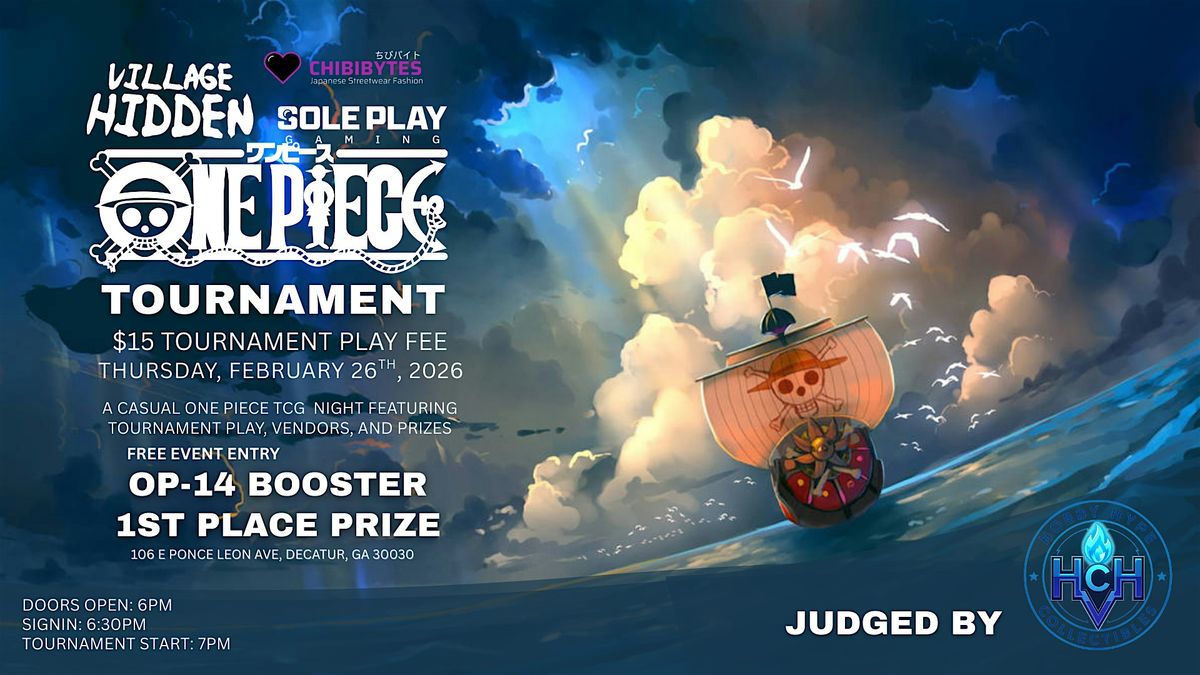Welcome to the OP14 One Piece Tournament in Decatur hosted by Chibibytes + Soleplay Gaming! Get ready for an epic showdown at Soleplay Gaming on February 26th, 2026 at 6:00 PM (Eastern Time). Join us for a day filled with intense battles, unforgettable moments, and tons of fun! Whether you're a seasoned pro or just starting out, this event is perfect for all One Piece fans. Don't miss out on the chance to showcase your skills and make new friends in the community. Mark your calendars and get ready to embark on an adventure like no other!