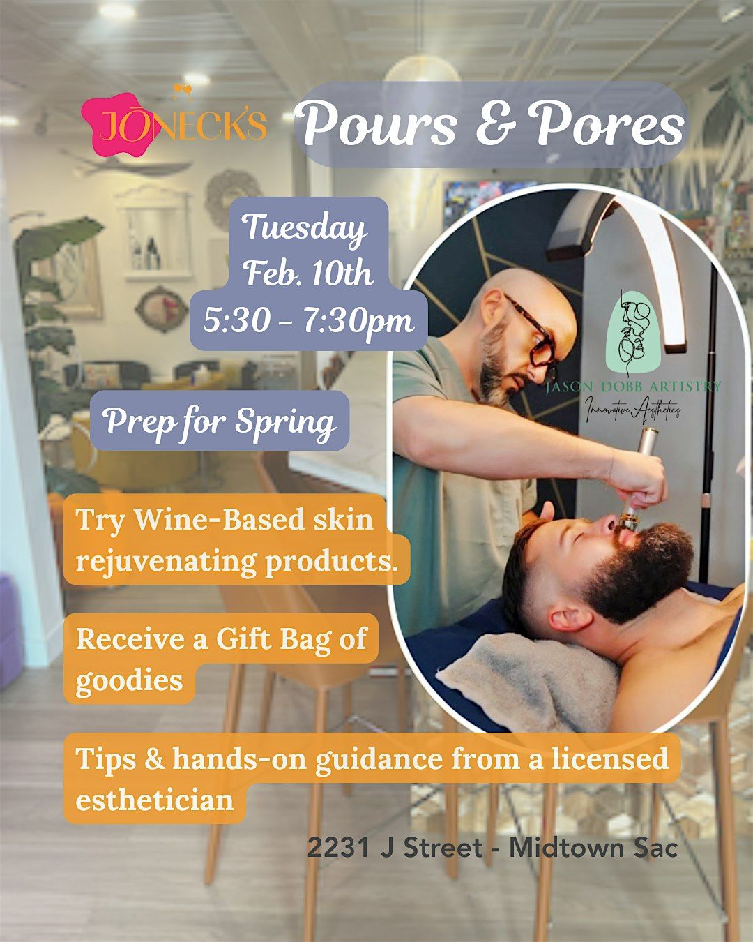 Refresh and rejuvenate your skin from winter gloom during an evening of guided facial tips with expert esthetician, Jason Dobb and go home with a goodie bag of wine-based skin care products!