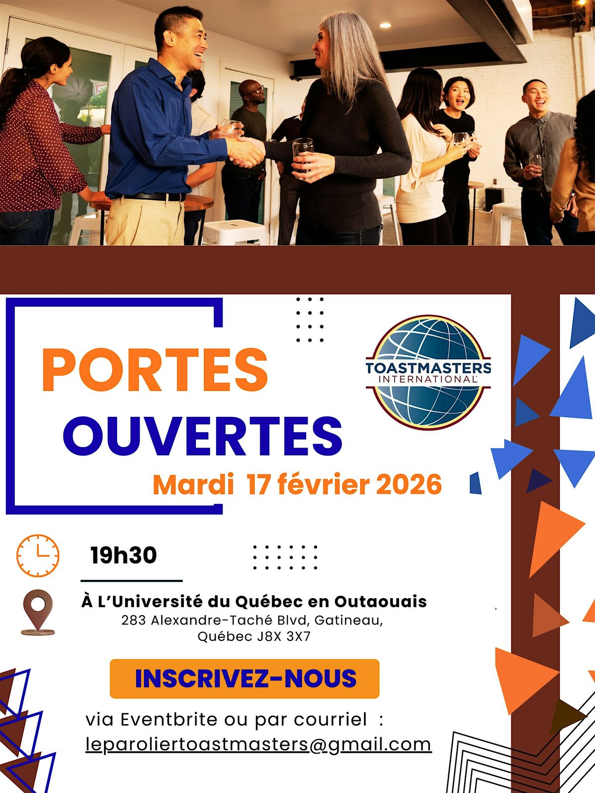 Une occasion unique de mieux connaître notre club, de rencontrer nos membres et de vivre l’expérience Toastmasters dans une ambiance chaleureuse et conviviale.