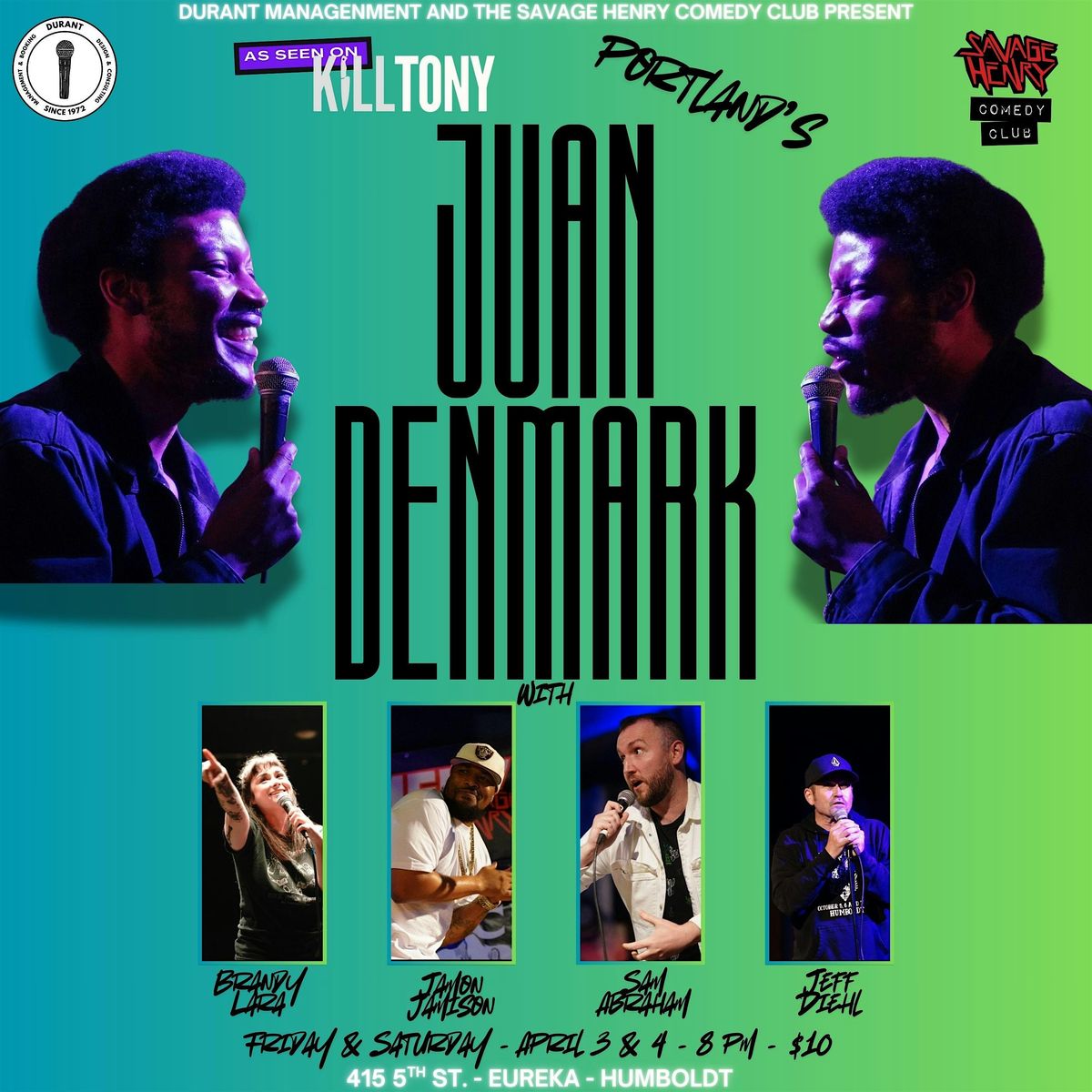 Juan Denmark, regular on K*ll Tony, is coming down from Portland Oregon to headline the club!! He will be supported by local comedians Brandy Lara, Sam Abraham, Jamon Jamison and Jeff Diehl