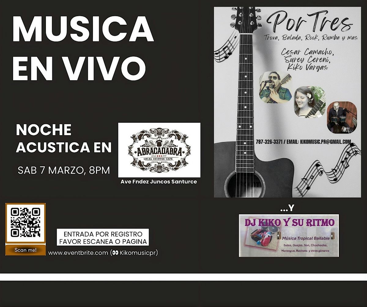 TODOS/AS Invitadas. Selecciona tu aportación de corazón. Ven y disfruta de la música distinta y diferente de PorTres y la comida riquisima de Abracadabra. Cocina hasta las 11pm. Tambien DJ Kiko con Salsa, Merengue y mas...