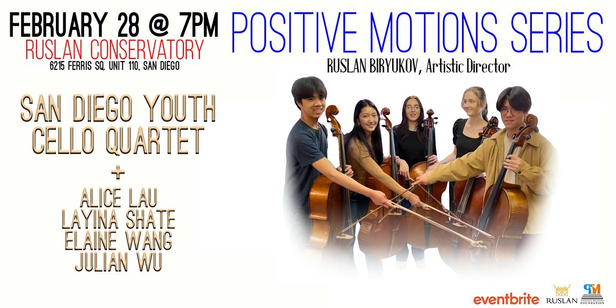 Acclaimed San Diego Youth Cello Quartet is one of the prime music ensembles originated at the RusLan Conservatory. Winners of the 2020 & 2025 California Music Teachers Association VOCE State Competitions will present a new program of virtuoso romantic and modern music.