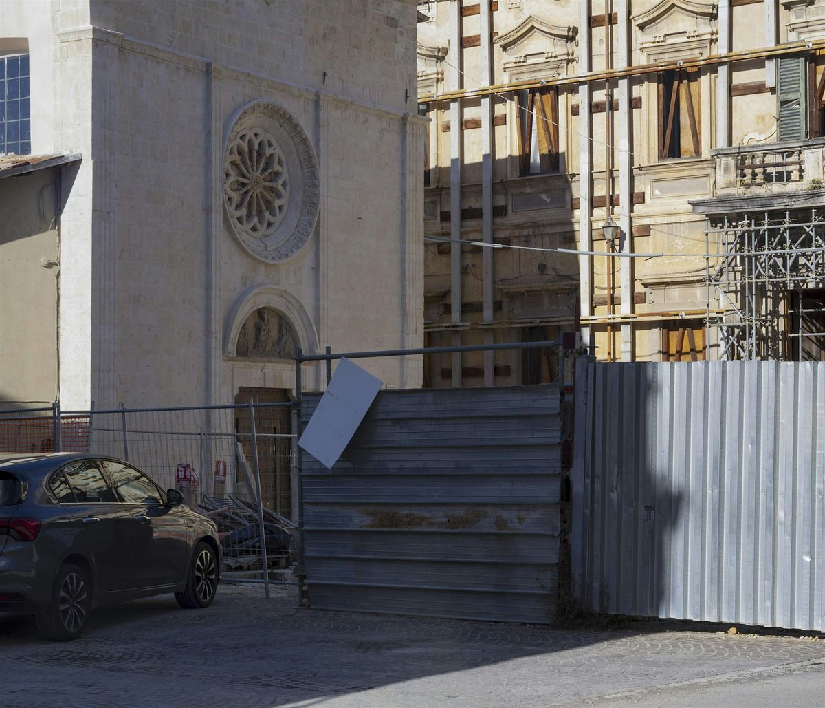 Image: Photograph by Antonio Di Cecco of the current urban landscape of L'Aquila: some buildings restored and some waiting, while construction fences invade the public space of a piazza and cars block the view.