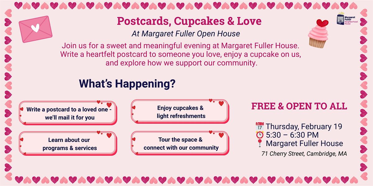 Join us for a sweet and meaningful evening at Margaret Fuller House. Write a heartfelt postcard to someone you love, enjoy a cupcake on us, and explore how we support our community.