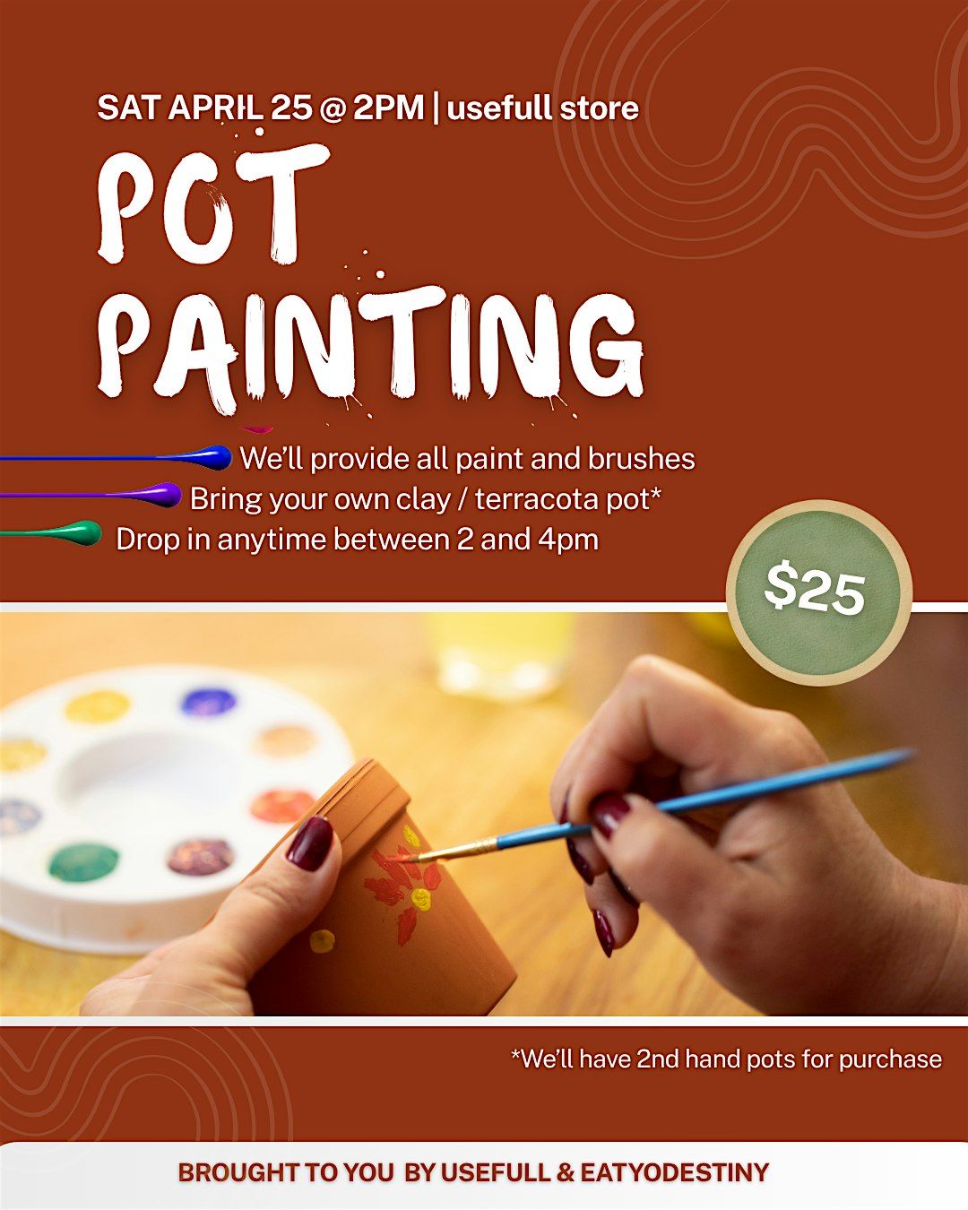 Drop in anytime between 2–4pm on April 25th to paint and decorate your very own plant pot. Bring your own clay or terracotta pot, or buy one of the affordable second-hand pots we'll have available. We'll supply all the paint and brushes. No art experience needed, just bring good vibes and creativity!