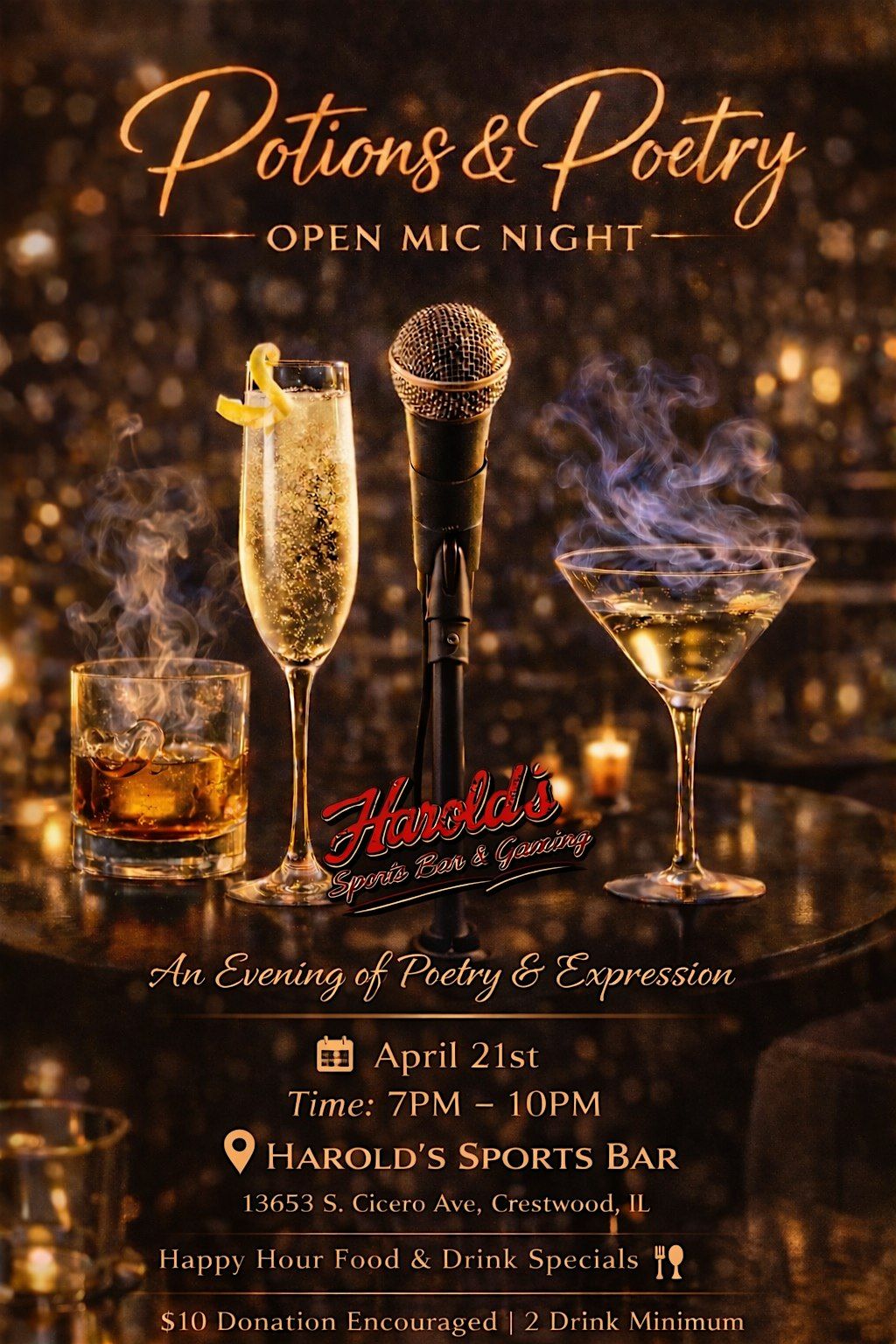 Step into an unforgettable evening where creativity, culture, and cocktails come together. Potions & Poetry is more than just an open mic, it’s an elevated experience designed for those who appreciate powerful words, smooth vibes, and a touch of nightlife sophistication.