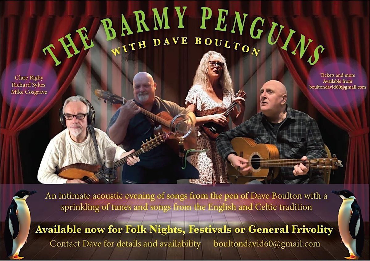 The Barmy Penguins are a quartet with Dave Boulton on guitar and vocals, Mike Cosgrave on cittern, weissenborn guitar and vocals, Clare Rigby on flute, whistles and vocals and Richard Sykes, a multi instrumentalist in pipes and vocals.
