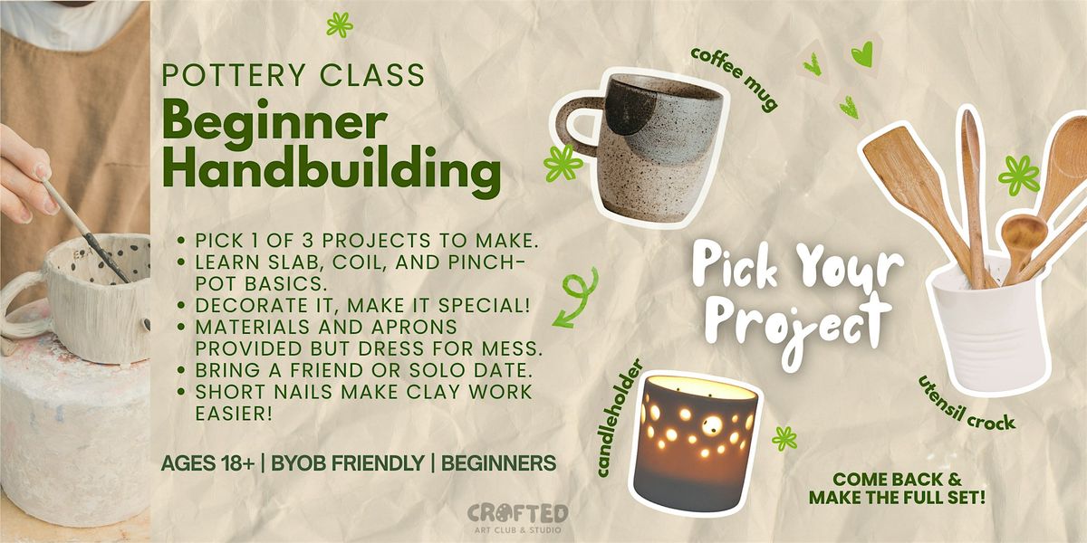In this 2-hour beginner-friendly pottery class, you’ll learn the foundations of handbuilding: pinch pots, coils, and slabs. Our expert ceramic artist will guide you through each step as you shape and customize your own functional or decorative pottery piece (cups, plates, etc.).