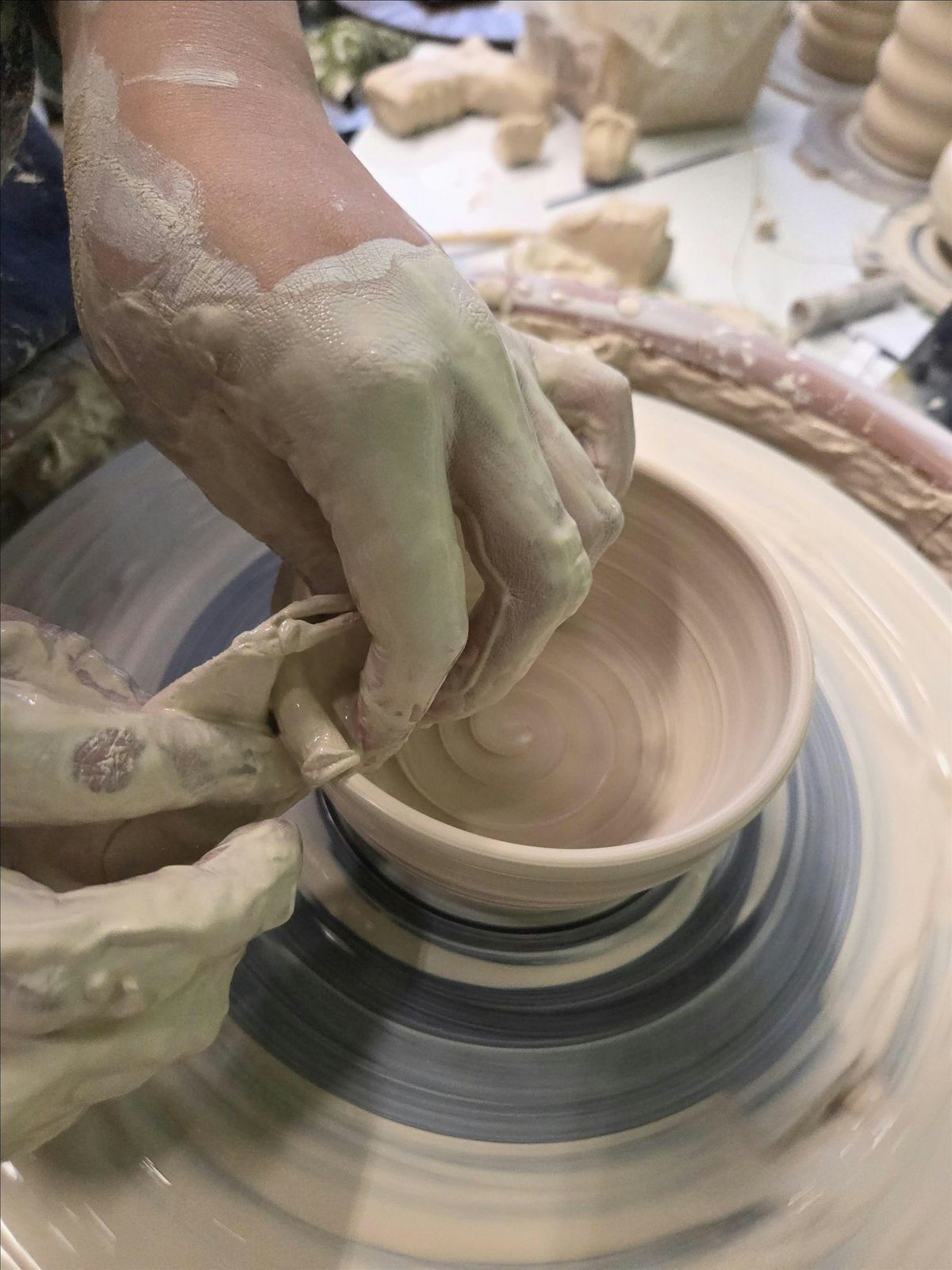 Join Tracy Flynn of Pottering Around Studios in a 3-session fun wheel throwing exploration class! Over the course of three weeks, you'll get to try your hand at throwing on the potter's wheel, trim and decorate your pieces, and experiment with glazes. You can expect to graduate from this class with enough skill to practice on your own, and having made 3-6 pieces. The sessions are all reserved for 3 hours, but some folks may finish early depending on work speed and aptitude. Guests are welcome to bring snacks and beverages.
