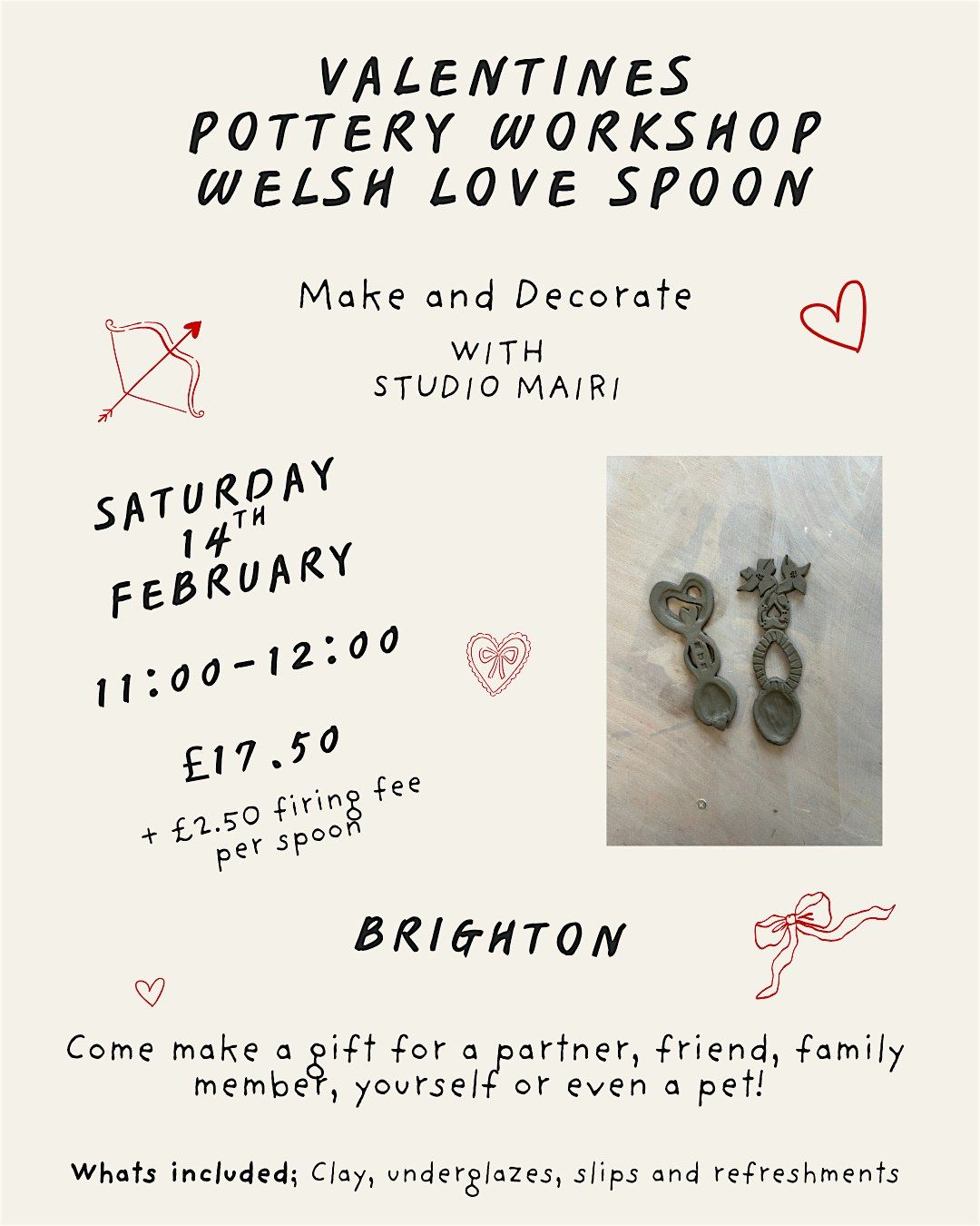Join us in person for a fun and hands-on pottery session! Create your very own Welsh Love Spoon, a traditional symbol of affection and craftsmanship. Whether you're a beginner or have some clay experience, this workshop is a great way to get creative and learn about this charming Welsh tradition. Bring your friends, partner or just yourself for an informal pottery workshop.