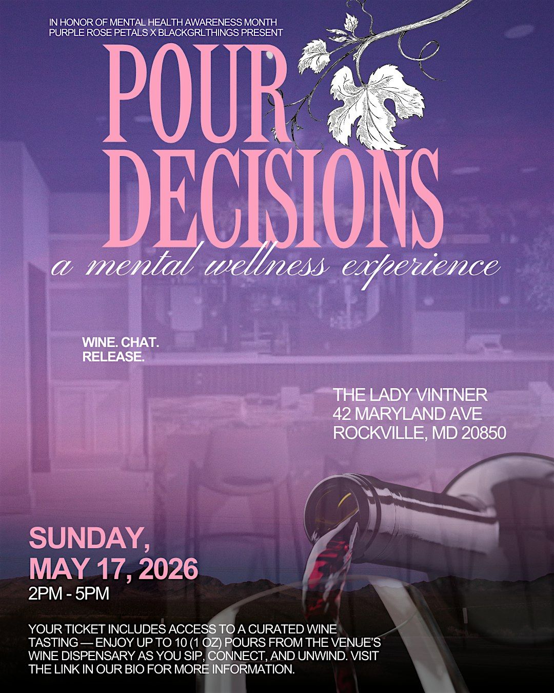 In honor of Mental Health Awareness Month, Purple Rose Petals x BlackGrlThings presents Pour Decisions: A Mental Wellness Experience — a curated mixer bringing together community, conversation, and reflection in an elevated wine bar setting.