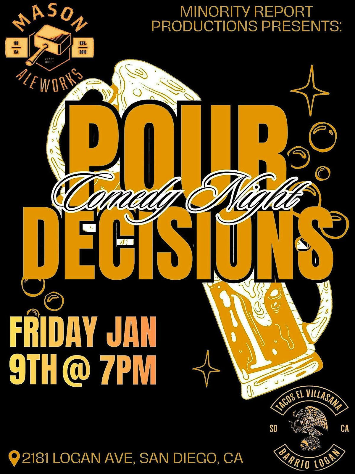 Get ready to laugh, sip, and snack your way through an unforgettable night at Pour Decisions Comedy Night, Barrio Logan’s newest comedy showcase featuring top local talent!