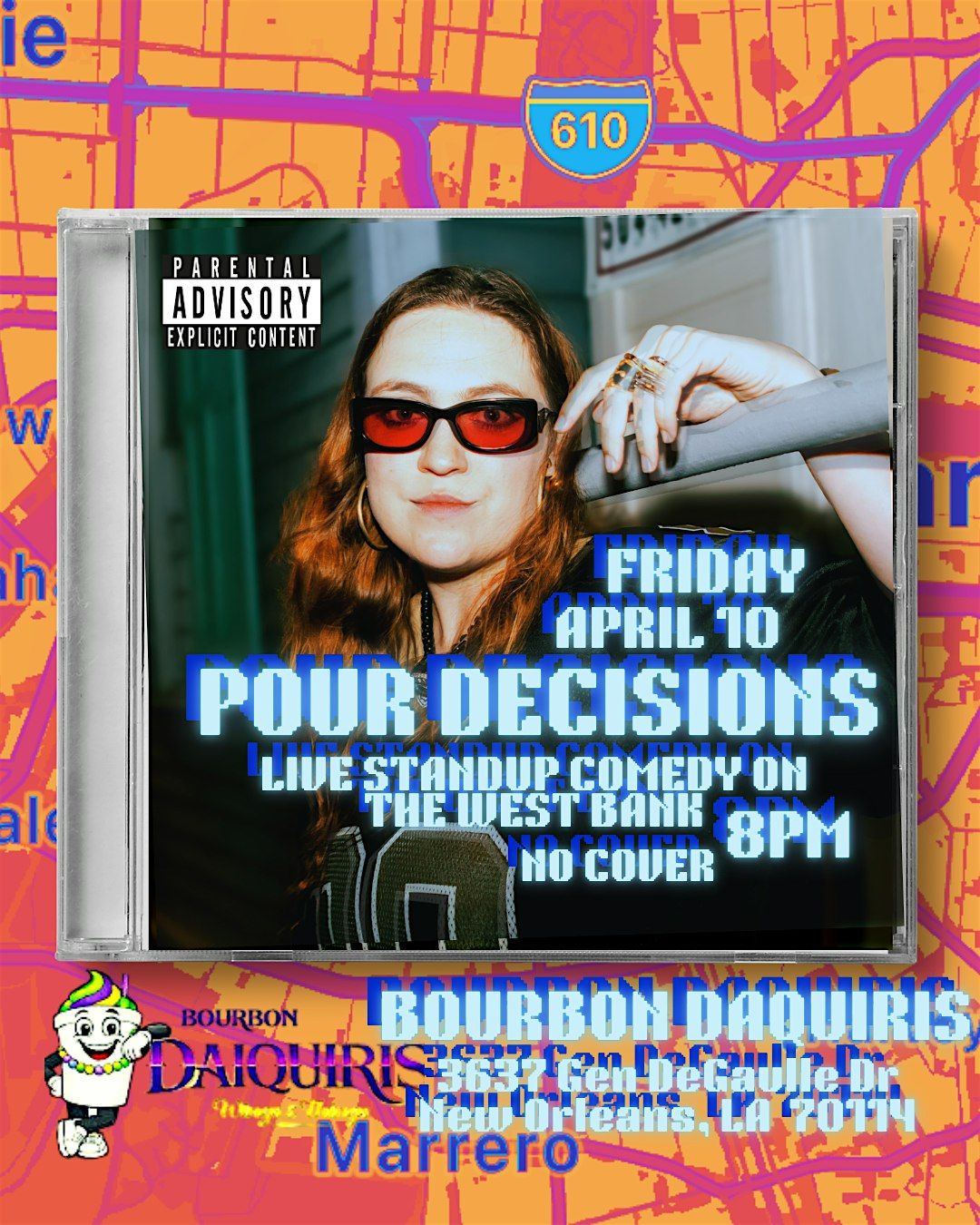 Bourbon Daquiri’s presents “Pour Decisions” a live standup comedy show on Friday, April 10th at 8PM. No cover. Hosted by Maggie Lambert.About this Event