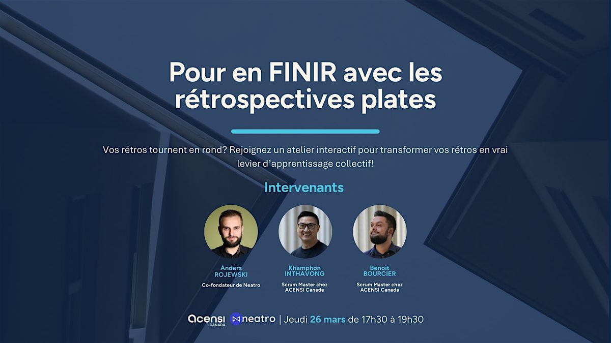 Partages d'expérience, apprentissages concrets et bonne humeur 100% garantis, un atelier animé par le co-fondateur de Neatro, Anders ROJEWSKI et les participations de Khamphon INTHAVONG et Benoit BOURCIER du cercle agile d'ACENSI Canada.