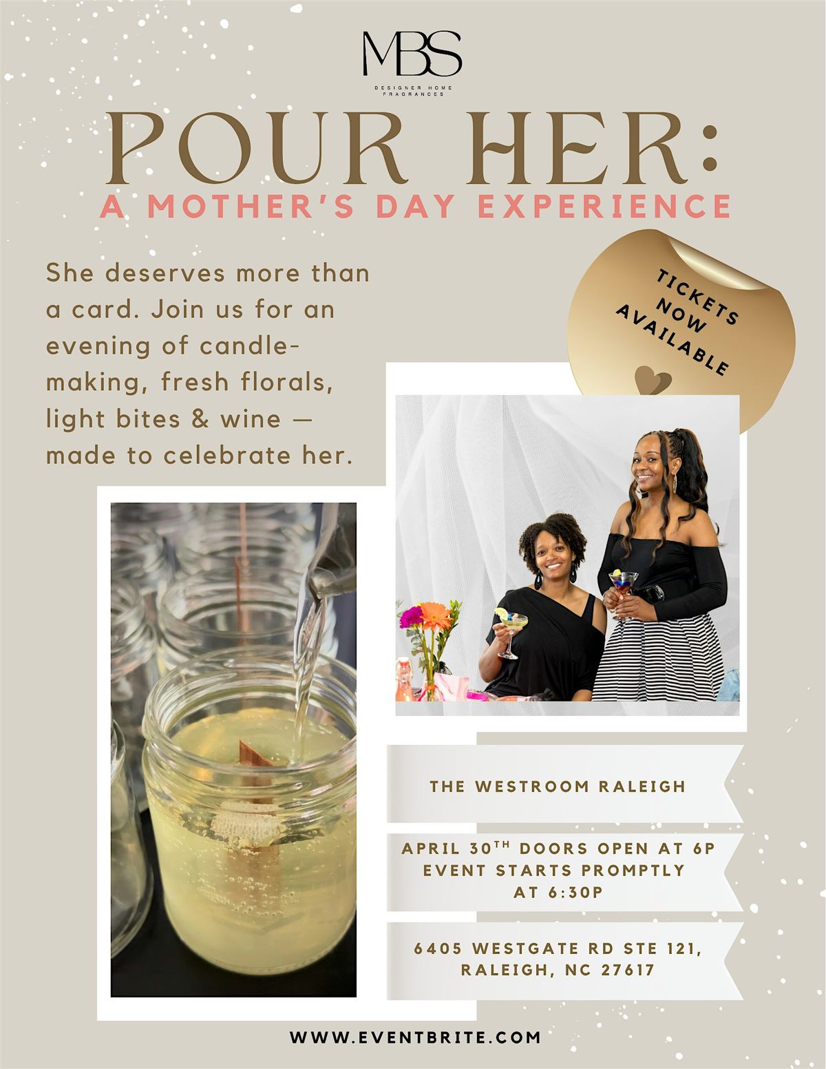 Pour Her: A Mother's Day Experience is an intimate, hands-on celebration for the moms, aunties, wives, mother figures, mother-in-laws, and every woman who has poured into someone else's life. Bring your husband, your son, your daughter, your best friend โ everyone is welcome, and everyone leaves with something beautiful.
