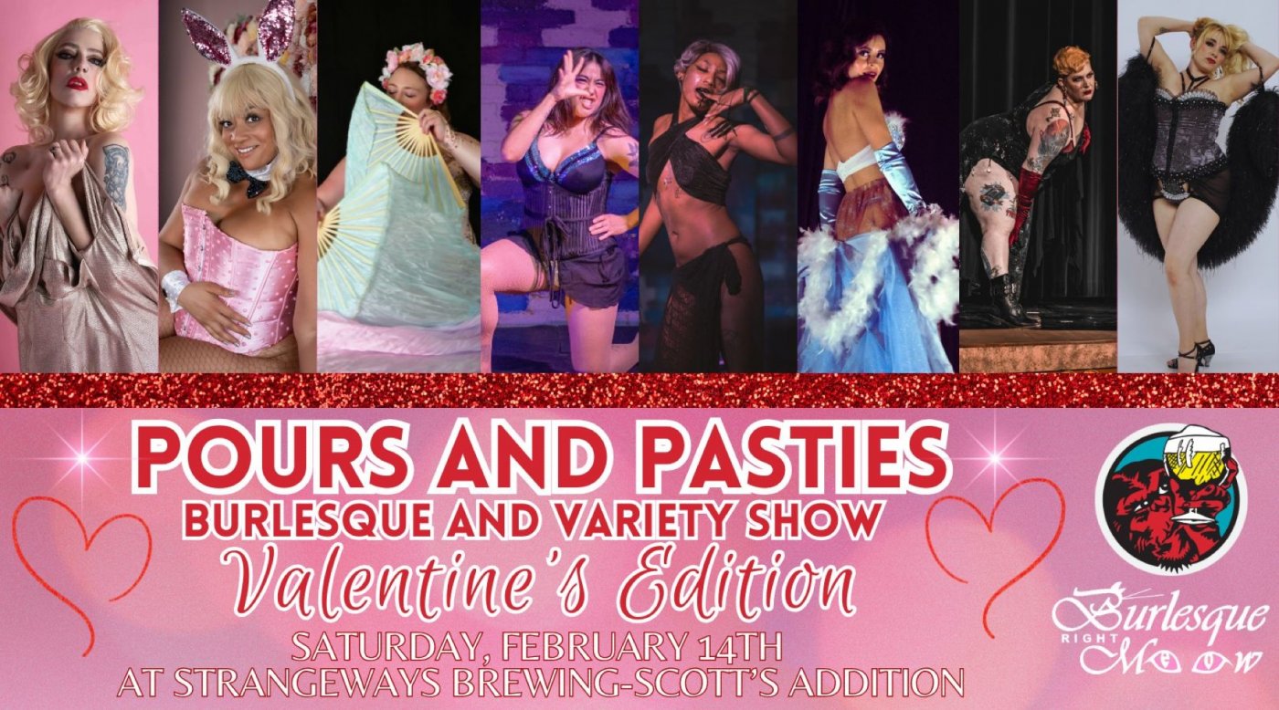 Spend Valentine’s Day where the beer is cold and the burlesque is hot! Pours and Pasties lands at Strangeways Brewing in Scott’s Addition. This is our first time at this location, and we’re bringing the tease right in front of you with an intimate floor show experience. Whether you're planning a romantic night out with your special someone or taking yourself out to celebrate self-love, there will be butts, and there will be beer, so everyone is a winner here! Get ready for an evening of love, laughter, and libations!