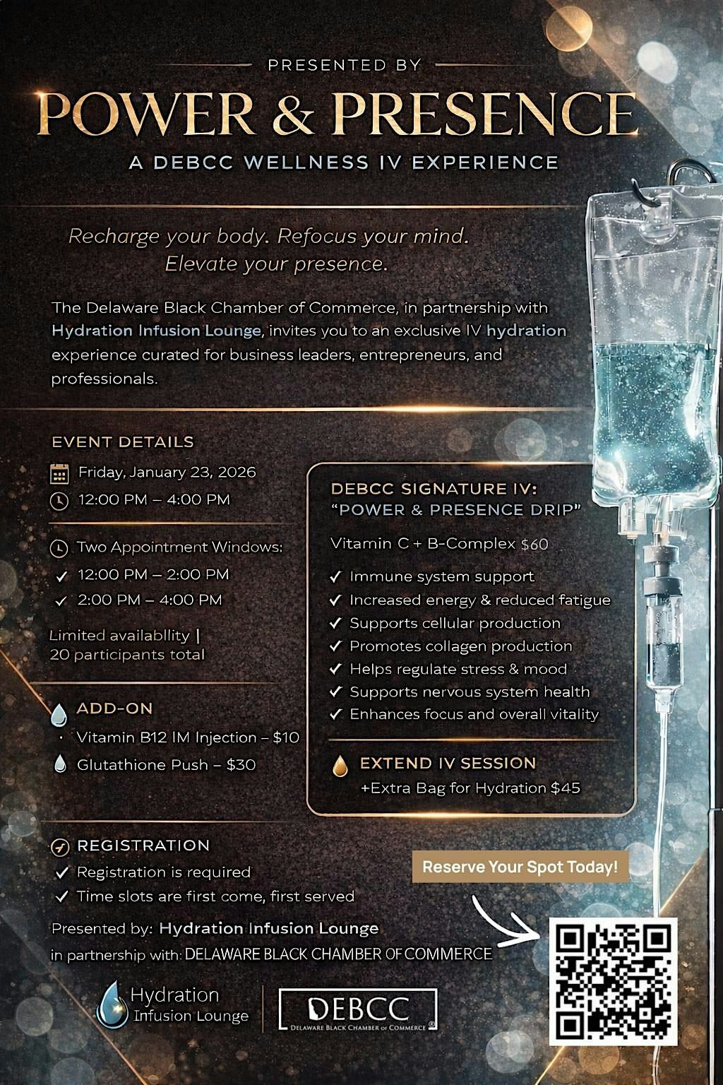 Recharge your body. Refocus your mind. Elevate your presence.Join us for an exclusive IV hydration experience designed to boost energy, immunity, stress management, and mental clarity—in partnership with DEBCC member Hydration Infusion Lounge.