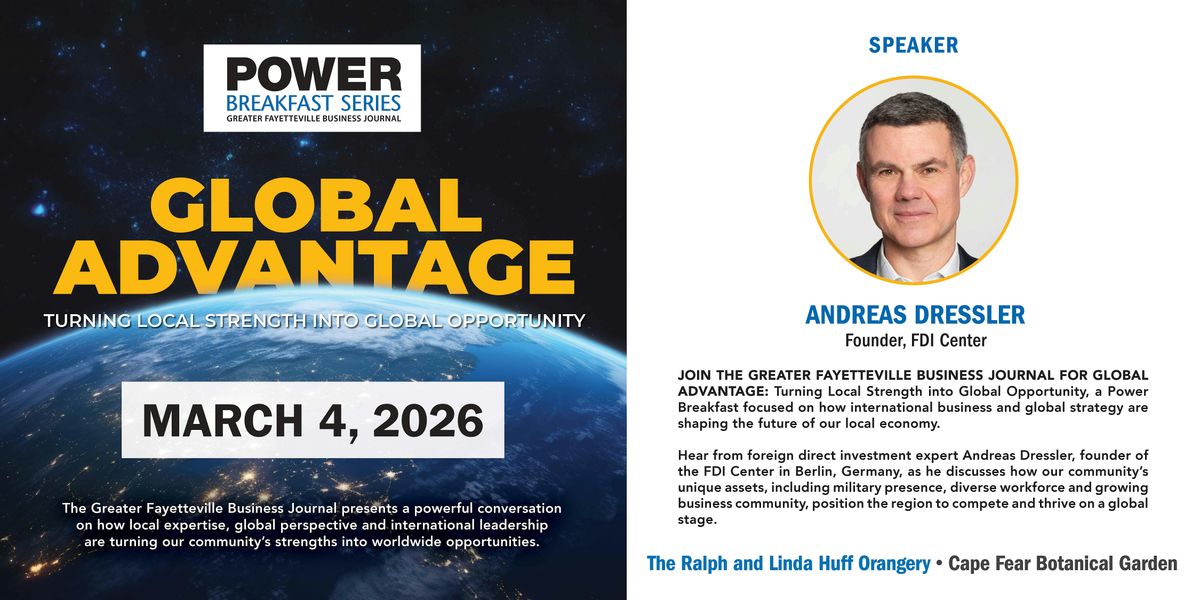 On March 4, 2026, the Greater Fayetteville Business Journal presents Global Advantage: Turning Local Strength into Global Opportunity, a Power Breakfast focused on how international business and global strategy are shaping the future of our local economy.