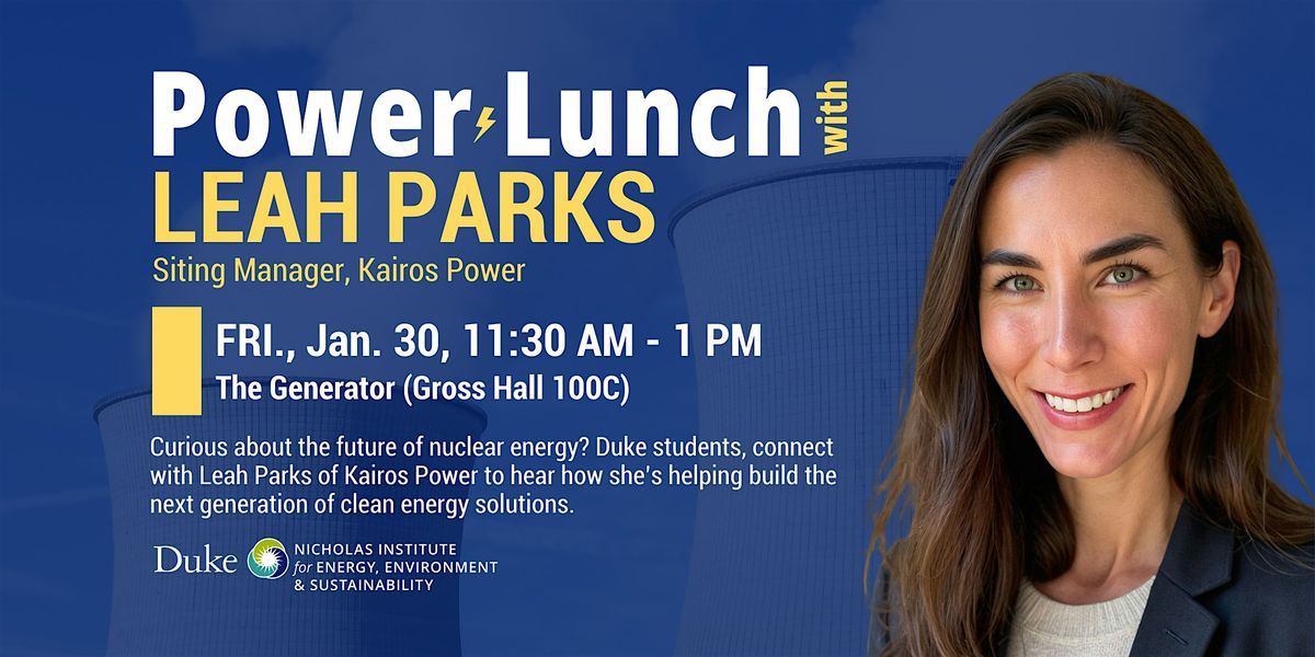 Current Duke students are invited to join our first Power Lunch of the fall 2026 semester, featuring Leah Parks, siting manager at Kairos Power. Kairos Power is a mission-driven engineering company focused on the delivery of a clean, affordable and safe energy solution through the integrated design, licensing and demonstration of advanced reactor technology. Parks will discuss her work, with Q&A to follow. Lunch will be provided.