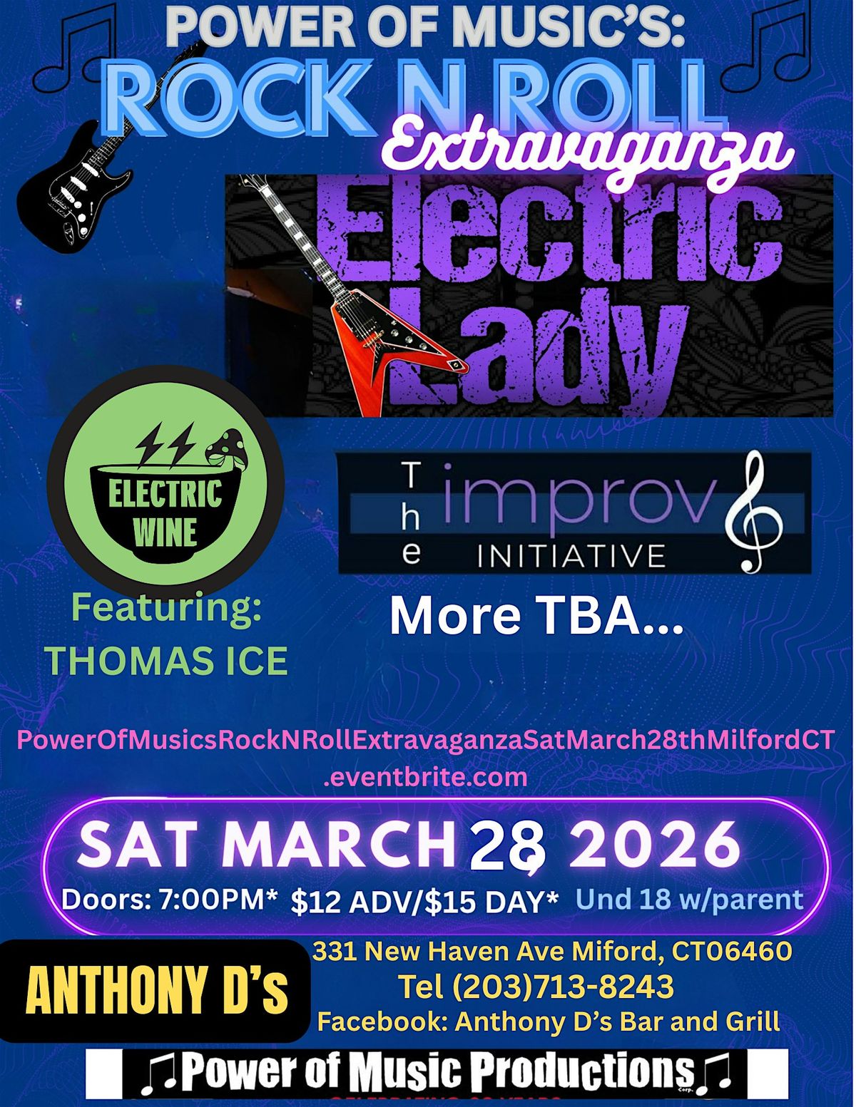 Get ready to rock out for Power Of Music's: Rock N Roll Extravaganza where the energy is off the charts and the vibes are all about good music and great times. Featuring performances by: ELECTRIC LADY (Jimi Hendrix tribute + great guitar driven originals), ELECTRIC WINE (featuring special guest: THOMAS ICE), THE IMPROV INITIATIVE (mostly instrumental hard rock jam band), and more TBA!!! Whether you're a die-hard fan or just wanna have fun, this event is your ticket to an unforgettable night filled with electrifying beats and legendary tunes. Don’t miss it!
