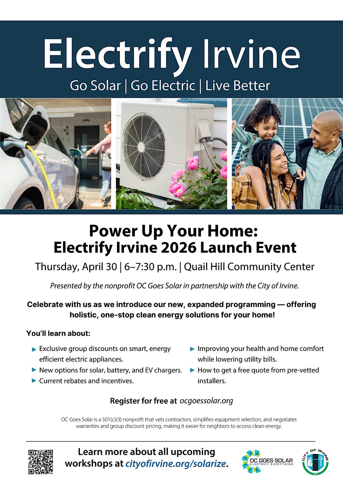 Join the 501(c)(3) Nonprofit OC Goes Solar & the City of Irvine for Electrify Irvine—a community-powered initiative making clean home upgrades easier and more affordable!