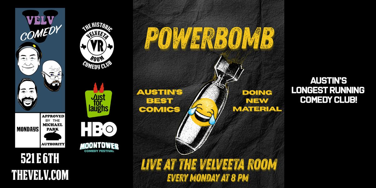 PowerBomb is The Velveeta Room’s new material night, where Austin’s best comics come to test their freshest jokes. Expect wild ideas, brand-new bits, and a few glorious crashes along the way. Past performers include Matt McCusker, James McCann, Pat Dean, Ari Matti, and more! Come see new bits get born (or die trying).