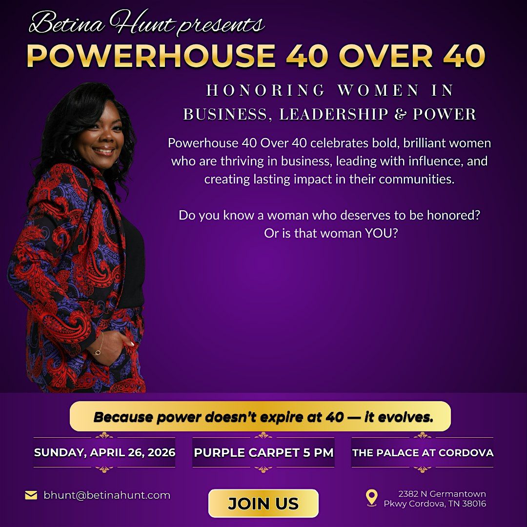 Join us for an unforgettable evening at the Powerhouse 40 Over 40 Recognition Ceremony, a premier celebration honoring dynamic women over 40 who are making a powerful impact in business, leadership, and their communities. This elegant event will take place on Sunday, April 26, 2026, at The Palace at Cordova, located at 2382 N Germantown Parkway in Cordova, Tennessee.